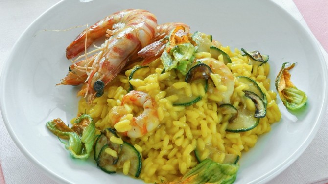 Risotto allo zafferano con zucchine e. Colorato e invitante il risotto è ottimo da inserire in ogni menu a base di pesce, per le feste oppure da gustare in ogni occasione. Corona di risotto alle zucchine con cuore di gamberetti all'arancia La ricetta è facile e veloce. Per la ricetta del risotto zucchine e gamberetti, sgusciate le code di gambero, eliminate il budellino nero e conservate i gusci.